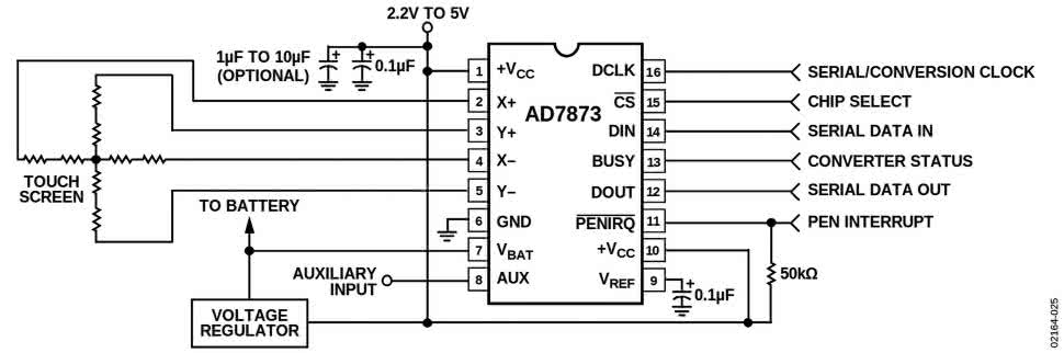 W procesie odczytu najpierw zasila się pierwszą warstwę poprzez przyłożenie napięcia pomiędzy należące do niej elektrody, a następnie odczytuje się napięcie w punkcie dotyku, używając pozostałych (niezasilonych) elektrod niczym… suwaka potencjometru. W wyniku pomiaru otrzymujemy wartość napięcia, która – po uwzględnieniu współczynników kalibracyjnych – pozwala na dokładne określenie pozycji w osi prostopadłej do zasilonych elektrod. Następnie procedura jest wykonywana analogicznie na drugiej warstwie, tj. po funkcjonalnej zamianie zestawów elektrod. W ten sposób można określić położenie punktu styku obu warstw ITO – do realizacji pomiaru wystarczy zatem… odpowiedni multiplekser oraz przetwornik ADC. Nic nie stoi oczywiście na przeszkodzie, by uprościć sobie pracę i zastosować scalony kontroler – przykład takiego rozwiązania można zobaczyć na rysunku 3.