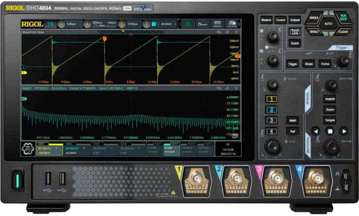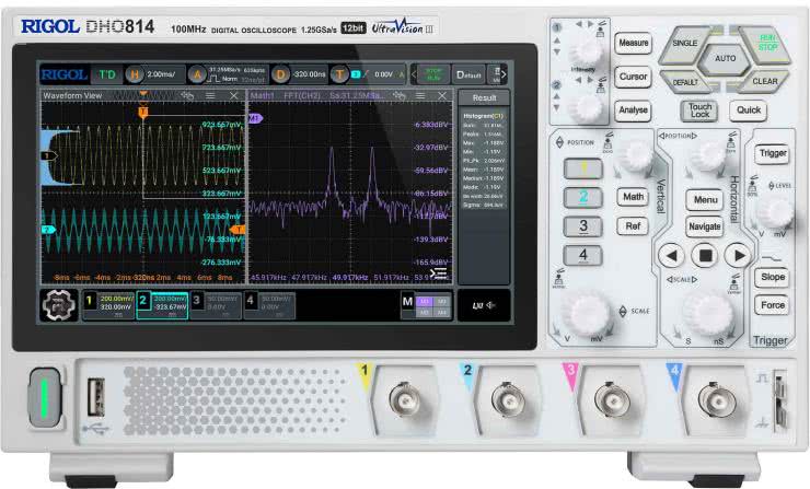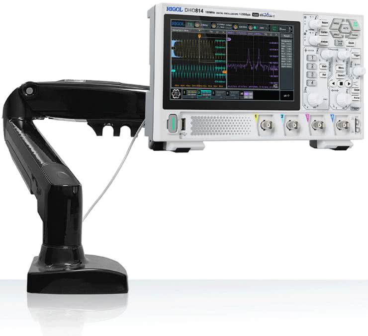 Urządzenia z tej serii są wyposażone w 10-calowy wyświetlacz dotykowy, a nowoczesny design podkreśla dodatkowo ciemnoszara kolorystyka i minimalistyczny design panelu frontowego. Sprzęt jest tak lekki, że z powodzeniem daje się zamontować na typowym wysięgniku przeznaczonym do podwieszania monitorów komputerowych z montażem VESA 100 mm. Pomysł podchwyciły inne marki, w tym wielokrotnie już przywołany w niniejszym artykule Rigol – seria DHO800 także może pracować „w powietrzu”, co pozwala zaoszczędzić niemałą przestrzeń na stole roboczym (fotografia 19).