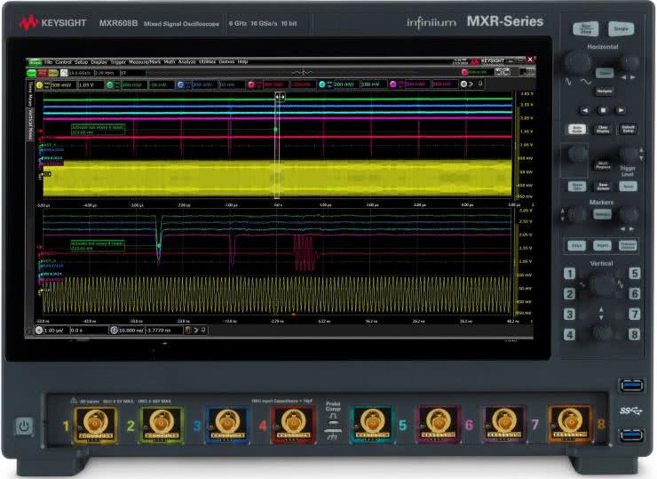 I choć 6- czy 8-kanałowe „potwory” wciąż nie są częstym widokiem na laboratoryjnych stołach, to sytuacja powoli zmienia się także w tym zakresie, a kolejni producenci opracowują nowe modele zaawansowanych oscyloskopów przeznaczonych do aplikacji wymagających jednoczesnej obserwacji przebiegów w wielu punktach układu. Jako przykład niech posłuży nam 8-kanałowy oscyloskop MXR608B marki Keysight (fotografia 16) – pomiary w paśmie do 6 GHz, we wszystkich kanałach jednocześnie, mogą być prowadzone z maksymalnym próbkowaniem 16 GSa/s.