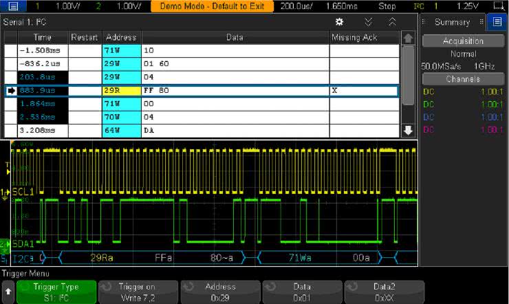 Samo dekodowanie komunikacji szeregowej czy wizualizacja mniejszych magistral równoległych (bądź wielu pojedynczych linii cyfrowych) w sposób synchroniczny z pomiarami analogowymi to jednak niejedyny aspekt istotny w pracy z systemami sygnałów mieszanych. Często równie ważne (albo nawet jeszcze ważniejsze) okazuje się wyzwalanie akwizycji analogowej w momencie wykrycia konkretnego zdarzenia (np. sygnału startu komunikacji I²C czy określonego bajtu w transmisji UART). Zastosowanie gotowej funkcji oczekującej na dane zdarzenie okazuje się niezastąpione zwłaszcza w bardziej złożonych przypadkach, gdyż z najprostszymi warunkami (np. detekcją zbocza opadającego na linii CS układu z interfejsem SPI) poradzi sobie nawet najprostszy oscyloskop bez żadnych dodatkowych opcji cyfrowych.