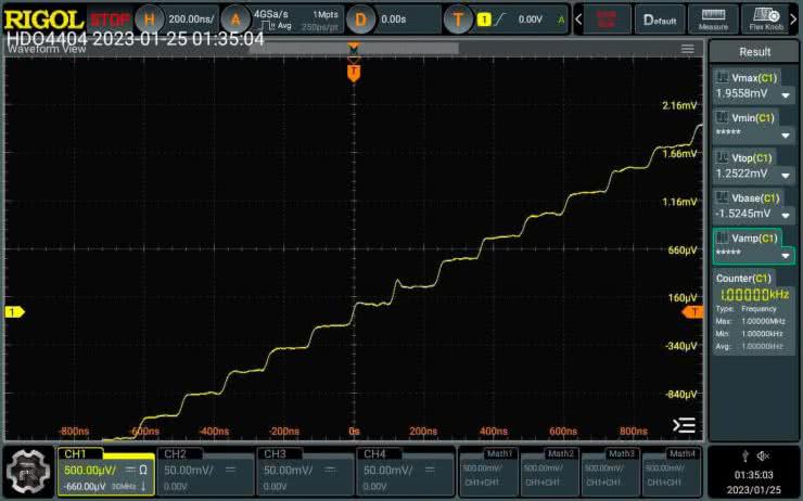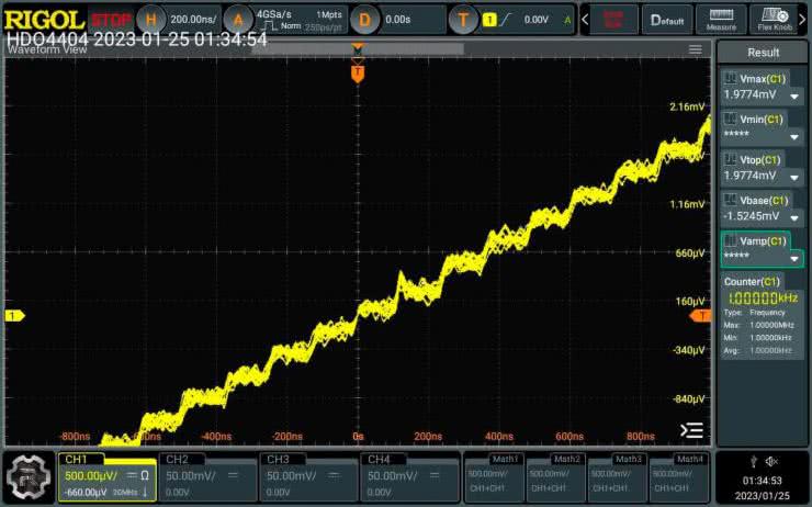 Doskonałym przykładem możliwości oferowanych przez współczesne oscyloskopy z przetwornikami 12-bitowymi jest „podejrzenie” sygnału wyjściowego generatora arbitralnego – mając do dyspozycji stosunkowo niedrogi oscyloskop DHO4000 marki Rigol (fotografia 7) można bez większego problemu przeanalizować schodkowy przebieg wynikający z kwantyzacji napięcia (rysunek 4).