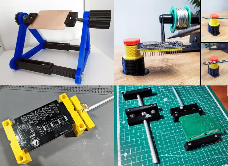 Uchwyty, imadła i regulowane „ręce” są też dostępne w formie wydruków 3D do samodzielnego wykonania. Zaletą jest niski koszt i możliwość dowolnej modyfikacji czy rozbudowy takiego rozwiązania. Wadą zaś – niska odporność na wysokie temperatury: PLA, najpopularniejszy filament, zaczyna mięknąć w temperaturze 50°C, a przy 85...90°C traci jakąkolwiek wytrzymałość mechaniczną. Materiały bardziej trwałe, np. nylon, wymagają nieco bardziej kosztownych drukarek z zamkniętą obudową oraz osuszaczy filamentu. Z drugiej strony nawet jeśli w trakcie prac uchwyt ulegnie uszkodzeniu, wykonanie nowego elementu kosztuje grosze. Przykłady takich projektów pokazuje fotografia 15.