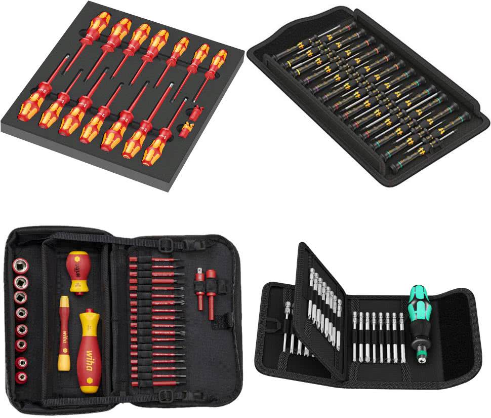 Ten sam producent ma też zestaw dedykowany dla elektroników: Kraftform Micro ESD Big Pack (05134019001) – wprawdzie nie zawiera on bitów Pozidriv, ale zamiast nich obejmuje szeroki wybór wkrętaków niestandardowych, spotykanych w różnych produktach z USA czy Japonii. Zestaw ten prezentuje fotografia 23b. Wiha oferuje zestaw wkrętaków slimVario electric (43465), podobny do pierwszego zestawu od Wery. Komplet Wera Kraftform Kompakt 62 (5059297001) również stanowi doskonały wybór, zawierając w sobie nie tylko podstawowe wkrętaki, ale też kolekcję wkrętaków niestandardowych – jest on bogatszy, a przy tym tańszy od zestawu Kompakt Micro ESD Big Pack, brakuje mu jednak mniejszych rozmiarów spotykanych w urządzeniach mobilnych czy w precyzyjnych mechanizmach. Widok produktu pokazano na fotografii 23d.