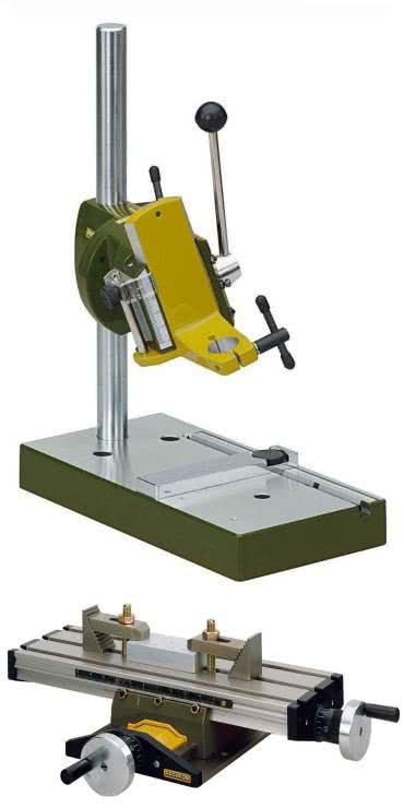Do tego zestawu przydać się może stół krzyżowy KT 70 (fotografia 28b) lub większy KT 150 – obydwa wymienione modele znacząco ułatwiają pozycjonowanie obrabianych elementów i ich precyzyjny ruch. Mocując szlifierkę w statywie, a pod nim stół krzyżowy z obrabianym elementem, możemy zagłębić w niego frez, a następnie – obracając powoli korbami – wykonać precyzyjne cięcie. Tak samo operuje się zresztą na tradycyjnych frezarkach manualnych. Do stojaka wiertarskiego można też dokupić imadło maszynowe ułatwiające wiercenie w drobnych elementach.