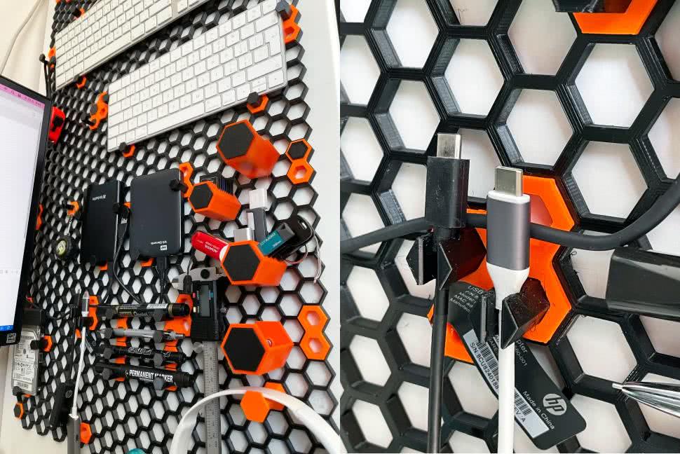 System Honeycomb Storage Wall opiera się o siatkę heksagonów, którą montuje się do ściany. Owa siatka składa się z mniejszych kawałków, dzięki czemu można wydrukować tyle elementów, na ile starczy miejsca na ścianie. Potem drukuje się zaczepy, haczyki, uchwyty, wieszaki czy tacki kompatybilne z innymi rozwiązaniami i montuje się je w dowolnych miejscach siatki „heksów”. Część elementów ma metalowe wzmocnienia, co pozwala umocować nieco cięższe narzędzia.