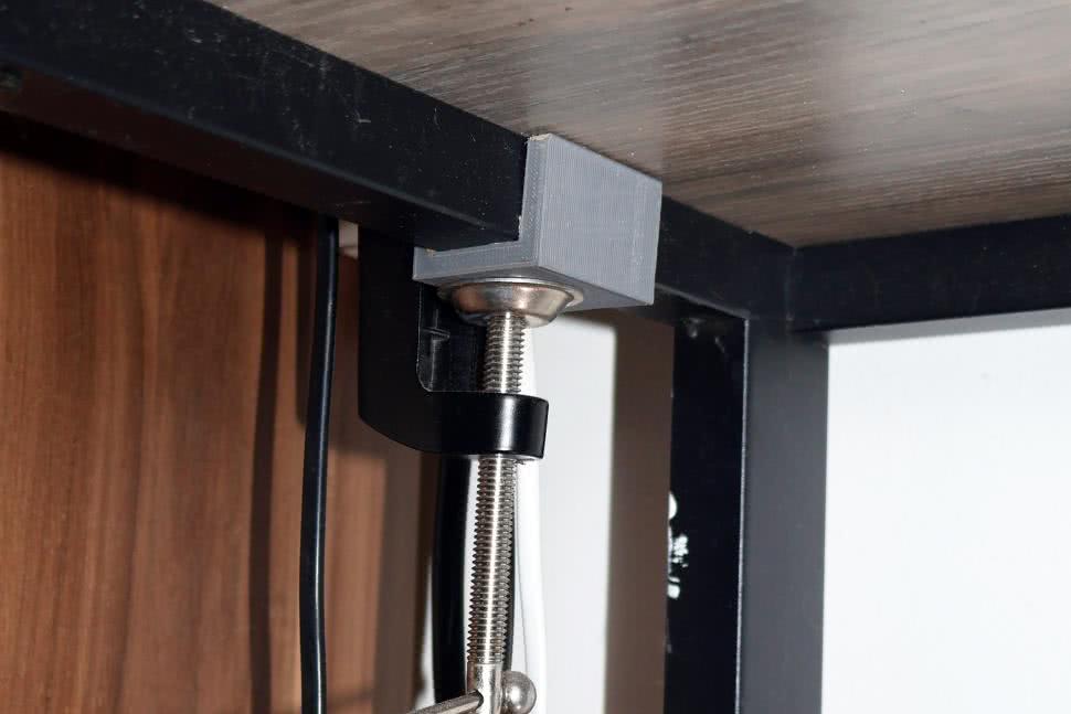 Na początek oświetlenie – i tu jedna, prosta sugestia: najlepszy wybór to lampa bądź lampy kreślarskie. Lampa taka, mocowana do krawędzi blatu, to bardzo elastyczne rozwiązanie zapewniające dużo światła w pożądanym kierunku. Urządzenia te projektowane były z myślą o tradycyjnych żarówkach o mocy 60 W, więc bez problemu można wkręcić żarówkę LED odpowiadającą jasnością żarówkom 100-watowym i mocniejszym. Sama żarówka powinna być wysokiej klasy, o najwyższej dostępnej wartości CRI (Color Rendering Index – indeks oddawania barw) i temperaturze barwowej powyżej 3000 K. Pewnym problemem może być mocowanie lampy do blatu, zależnie od konstrukcji biurka/stołu – lecz tu ponownie pomóc może druk 3D, co pokazuje fotografia 32 – podobny element pomoże też w mocowaniu lekkiego imadła do blatu.