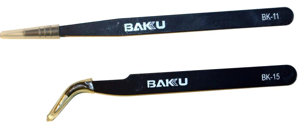 Przy ręcznym montażu komponentów SMD, a także podczas lutowania przewodów i drutów w celu dokonania pomiarów w trudno dostępnych miejscach czy też modyfikacji układu pęseta staje się narzędziem wręcz niezbędnym. Wbrew pozorom nie musi to być narzędzie kosztowne i z najwyższej półki, nie trzeba mieć też każdego dostępnego modelu. Z powodzeniem wystarczą dwa narzędzia: proste i zakrzywione. Dobrym wyborem są pęsety firmy Baku pokazane na fotografii 16, ze względu na korzystny stosunek jakości do ceny. Modele te zapewniają pewną ochronę ESD dzięki naniesionej powłoce izolacyjnej na niemal całą powierzchnię pęsety.