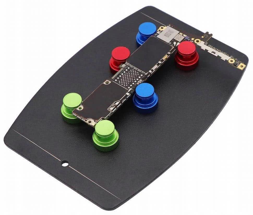 Należy za to wystrzegać się tanich uchwytów magnetycznych (fotografia 10) – aluminiowe elementy z magnesami neodymowymi zwyczajnie przesuwają się po podstawce, a uchwycenie płytki między nimi jest zadaniem niełatwym. Przy próbie użycia lutownicy tradycyjnej płytka „ucieknie” i wypadnie spomiędzy trzymających ją elementów. Użycie kolby hot air ma większy sens, ale nawet wtedy zbyt duży nacisk pęsetą skończy się podobnym fiaskiem.