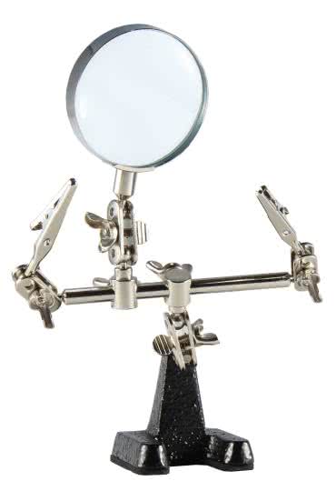Niewątpliwą pomyłką natury jest fakt, iż elektronik posiada tylko dwie ręce, przez co nie może jednocześnie trzymać płytki drukowanej, komponentu, spoiwa lutowniczego i kolby. Ten ewidentny błąd ewolucji można obejść, stosując specjalne uchwyty i stojaki do płytek oraz „trzecie ręce”. Najprostszym i najtańszym przykładem jest prosty uchwyt z lupą, pokazany na fotografii 8. Ma on zwykłe „krokodylki” w roli chwytaków i zazwyczaj jest wystarczający przy lutowaniu przewodów i niektórych złączy. Ma jednak dwie wady: pierwszą są same „krokodylki”, które z łatwością zedrą soldermaskę z każdej płytki. Warto więc zabezpieczyć tę ostatnią kawałkiem chusteczki higienicznej lub ręcznika papierowego. Drugą wadę stanowi sposób ich montażu – dość szybko pojawiają się luzy. Jednak tego typu „trzecia ręka” jest niezastąpiona, gdy pracuje się z dużymi komponentami w technologii przewlekanej.