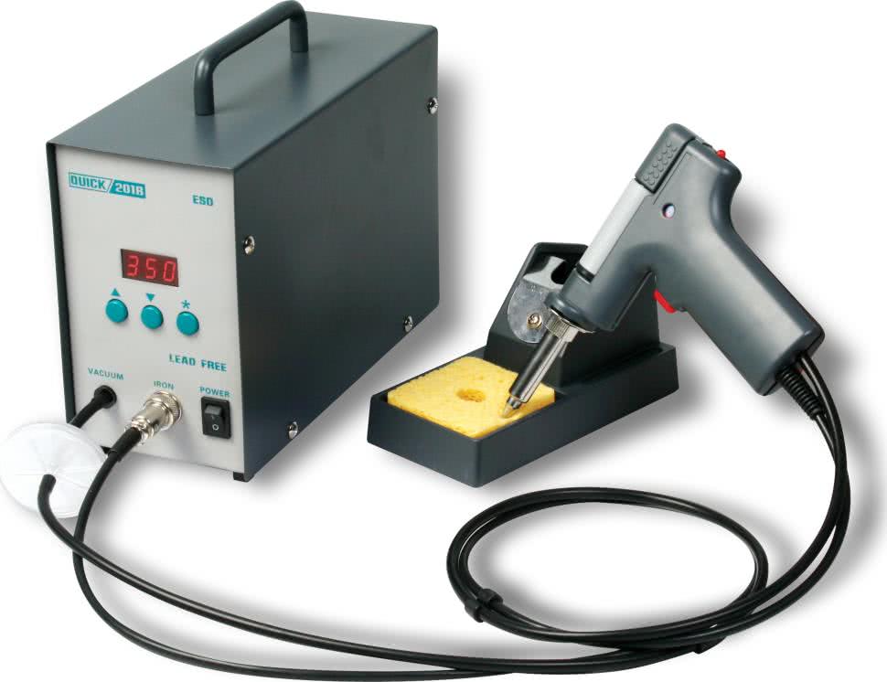 Pewnym ułatwieniem w przypadku płytki dwustronnej jest odsysacz elektromechaniczny, który od odsysacza tradycyjnego różni się tym, iż zakończony jest kompletną kolbą rozlutowniczą z elementem grzejnym i grotem w formie wydrążonego stożka zwieńczonego otworem. Taki odsysacz jednocześnie roztapia spoiwo, ogrzewa pole lutownicze i wyprowadzenie, pozwala zatem usunąć spoiwo także z wnętrza otworu. Oczywiście część odsysająca jest wciąż mechaniczna, a do tego często nie mamy możliwości regulacji temperatury. Tańsze odsysacze tego typu łatwo się psują, ale jako alternatywa dla odsysaczy mechanicznych są dobrym wyborem. Urządzenie z omawianej grupy można zobaczyć na fotografii 2.