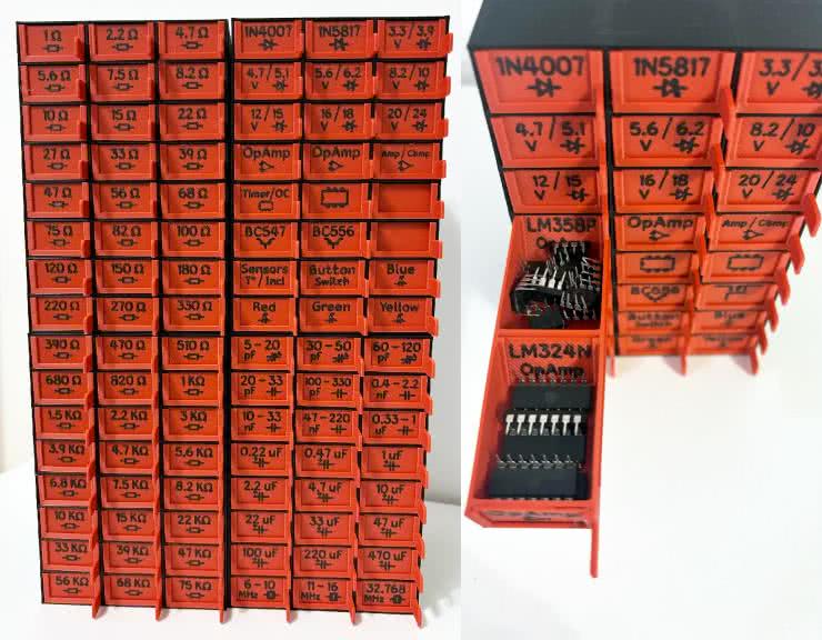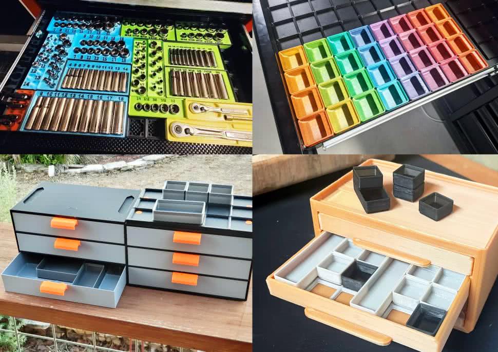 Na poratlu Printables można natomiast pobrać kolekcje plików Gridfinity, w tym specjalne rozwiązania do tworzenia szuflad z drobnymi częściami. Dla fanów bardziej tradycyjnych rozwiązań dostępne są tradycyjne organizery z szufladkami. Fotografia 36 prezentuje jeden z takich projektów ze strony Printables, którego autorem jest Vadim.