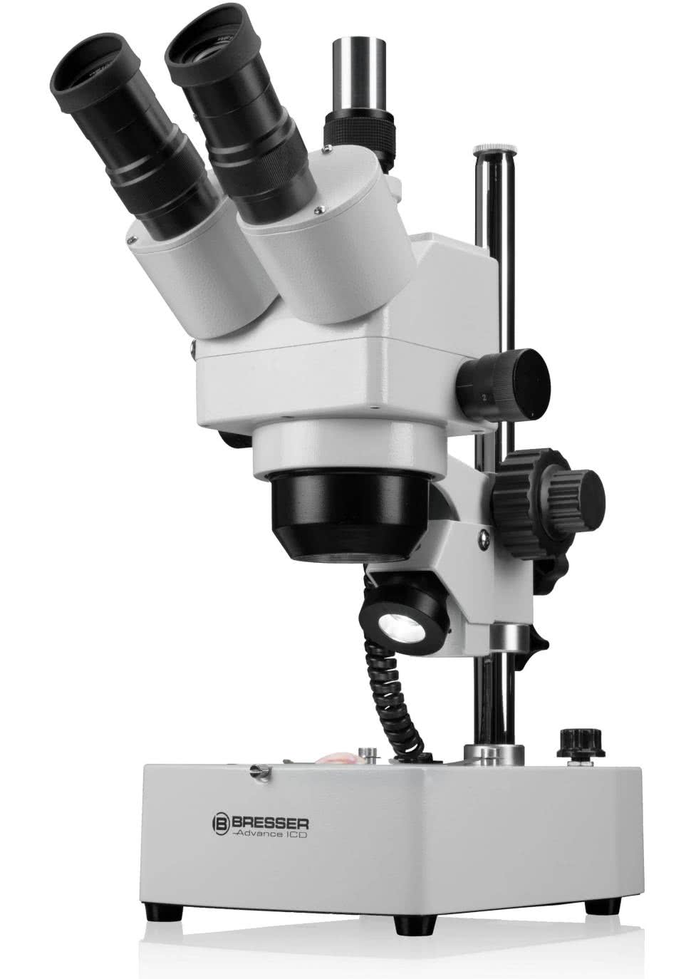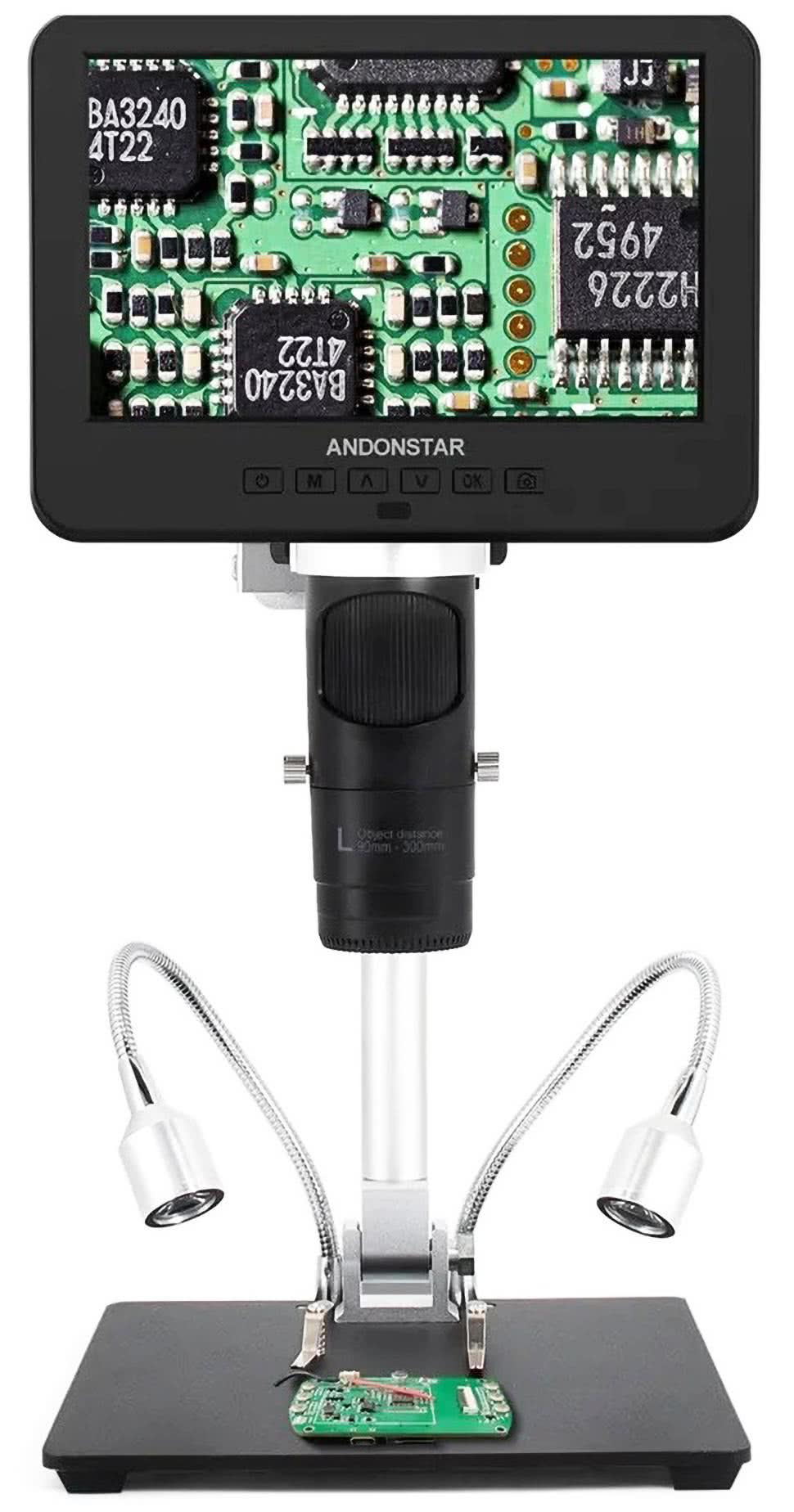 Praca z drobnymi elementami czasem wymaga też pomocy w formie narzędzi powiększających. Wspomniana wcześniej „trzecia ręka” jest zwykle wyposażona w lupę, ale takie proste szkło powiększające może nie wystarczyć. Elektronik często musi posiłkować się odpowiednim mikroskopem. Istnieją dwa warianty: optyczny i elektroniczny. Mikroskopy optyczne, jak pokazany na fotografii 37 Bresser Advance ICD, są dość kosztowne, ale oferują percepcję głębi, co znacznie ułatwia pracę. Dodatkowo nie wprowadzają one żadnych opóźnień, a obraz wygląda naturalnie.