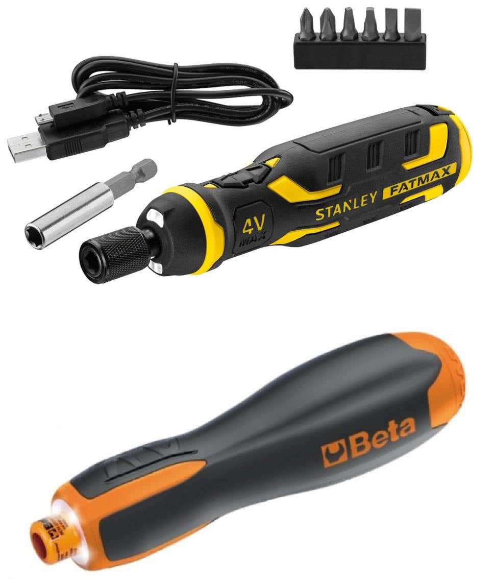 Wkrętarki i wkrętaki elektryczne są dość prostymi narzędziami pod względem konstrukcyjnym. Główną różnicą między poszczególnymi modelami różnych marek jest jakość wykonania i pojemność akumulatora. Dla przykładu – Wiha ma w ofercie zestawy bitów z wkrętakami PocketDrive oraz speedE II electric. Zaletą tych zestawów jest dobra jakość bitów. Firma Stanley oferuje relatywnie tani wkrętak z serii Fatman (FMTH66719), pokazany na fotografii 25a.