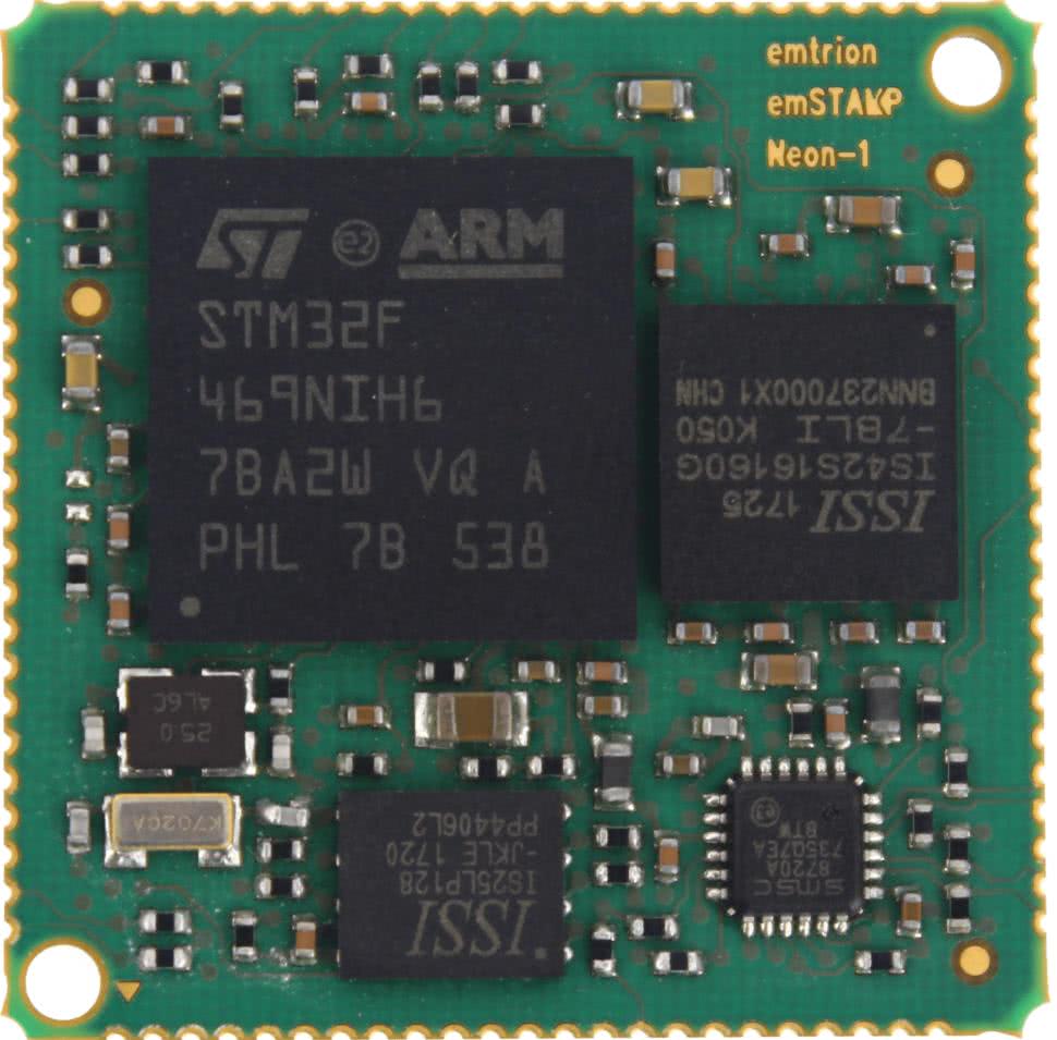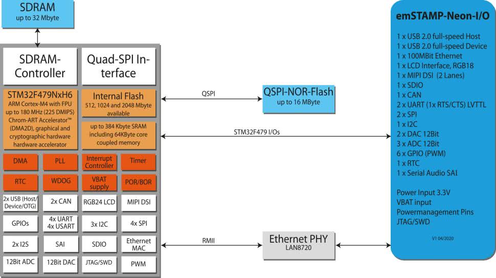 I takie właśnie założenia przyświecają producentom modułów opartych na większych mikrokontrolerach, jak chociażby emSTAMP-Neon-CM4 (fotografia 6, rysunek 3) – oprócz samego mikrokontrolera (w tym przypadku jest to STM32F479 z rdzeniem ARM Cortex-M4) na pokładzie modułu znalazły się tylko najważniejsze peryferia: pamięci SDRAM oraz NOR Flash, zestaw podstawowych elementów pasywnych oraz – dodatkowo – układ Ethernet PHY.