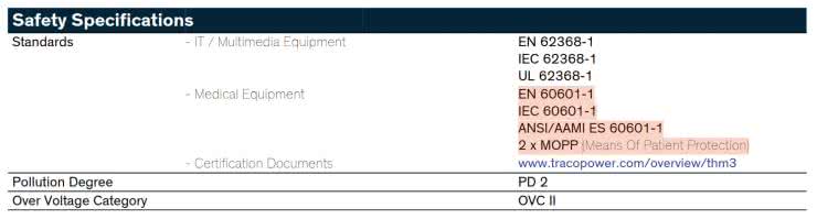 Z tego samego powodu w projektach medycznych unika się zwykle stosowania przetwornic DC/DC czy modułów zasilaczy, których producent nie określił explicite ich medycznego przeznaczenia. Nawet, jeżeli dany model konwertera lub zasilacza sieciowego oferuje wysoki poziom napięcia izolacji, to sama konstrukcja wewnętrzna zastosowanej bariery galwanicznej także ma znaczenie dla spełnienia (lub nie) wymogów normy 60601-1. Dlatego też producenci przetwornic, od których zależy stopień ochrony przed porażeniem pacjenta i/lub operatora, wprost odwołują się do konkretnych zapisów ww. standardu, dzięki czemu konstruktor ma pewność, że wybierając dany produkt jest w stanie zapewnić wymagany poziom bezpieczeństwa.