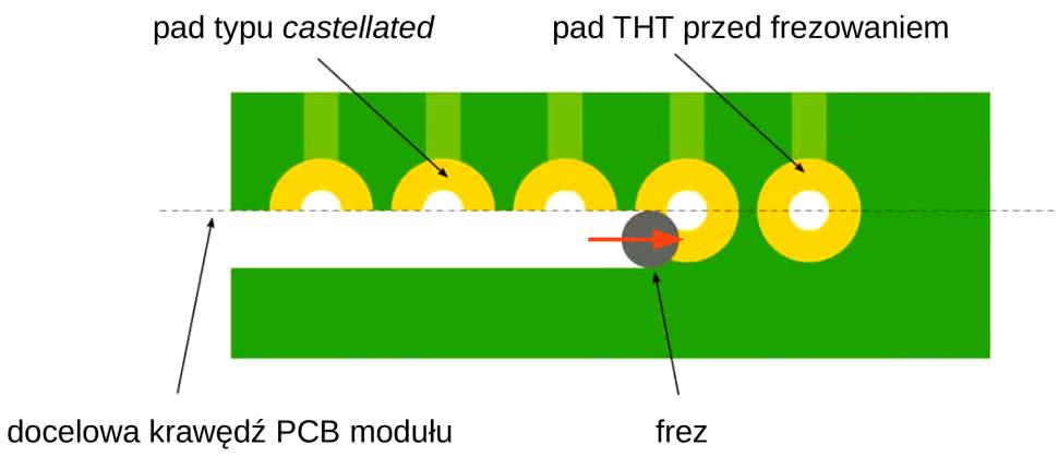 Jednym z najbardziej popularnych i uniwersalnych sposobów integracji modułów – zwłaszcza komunikacyjnych czy niektórych minikomputerów SoM – jest zastosowanie padów typu castellated. Są to metalizowane otwory, umieszczone na krawędzi płytki modułu i – już po metalizacji – częściowo sfrezowane (rysunek 9), przez co przypominają nieco swoim kształtem zwieńczenie muru baszty obronnej, czyli tzw. blanki (stąd zresztą anglojęzyczna nazwa tego rodzaju wyprowadzeń).