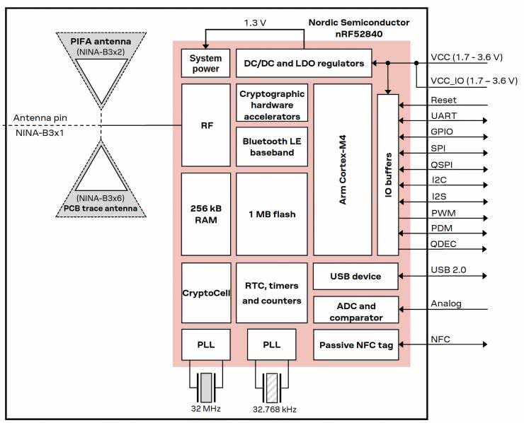 Dzięki temu we wszystkich tych projektach, które i tak wymagają użycia dodatkowego MCU, możliwe jest szybkie wdrożenie funkcjonalności radiowych w oparciu o gotowy firmware, a jeżeli czas i zasoby ludzkie firmy na to pozwalają, konstruktor urządzenia docelowego może zdecydować się na skorzystanie z wewnętrznego mikrokontrolera układu nRF (rysunek 5), który zostanie zaprogramowany np. z użyciem oficjalnego środowiska deweloperskiego firmy Nordic. To drugie rozwiązanie – choć przeważnie okaże się dalece bardziej praco- i czasochłonne, zwłaszcza jeżeli programista odpowiedzialny za oprogramowanie wbudowane nie pracował wcześniej z platformą nRF – będzie nie tylko bardzo kompaktowe, ale także znacznie tańsze (pod względem BOM) i zapewne również bardziej energooszczędne w porównaniu do wariantu korzystającego z dodatkowego mikrokontrolera.