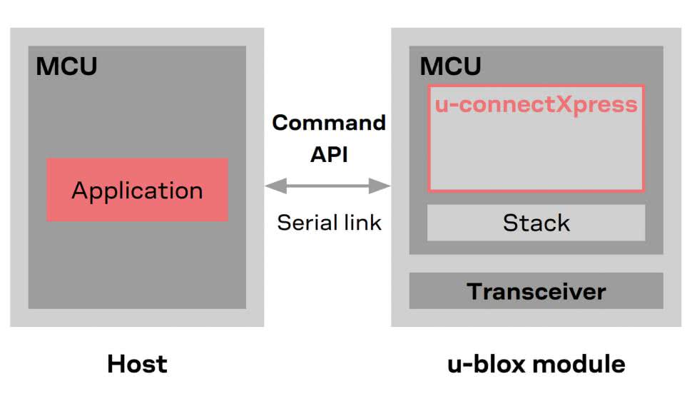 W tym miejscu warto wspomnieć o interesującym rozwiązaniu, które wdrożyła firma u-blox. Producent dostrzegł bowiem fakt, że w przypadku rozbudowanych układów radiowych SoC – takich, jak procesory z serii nRF marki Nordic Semiconductor – zaprzęgnięcie SoC tylko do obsługi radia (np. Bluetooth LE) byłoby w wielu przypadkach marnotrawstwem zasobów, wymuszającym użycie dodatkowego, zewnętrznego mikrokontrolera do obsługi wszystkich pozostałych funkcjonalności docelowego urządzenia. Dlatego też firma u-blox dała swoim odbiorcom wybór – te same moduły (np. z serii Nina-B3 – fotografia 8) są dostępne zarówno w wersji z fabrycznie wgranym oprogramowaniem u-connectXpress (implementującym cały stos komunikacyjny oraz dekoder komend AT – rysunek 4), jak i w tzw. wariancie Open CPU (gotowym do zaprogramowania przez użytkownika).