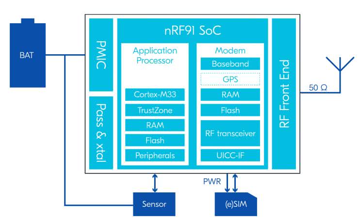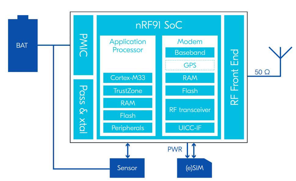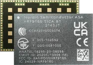 Przykładowym układem SiP, który zawiera w swojej strukturze modem LTE-M/NB-IoT, jest nRF9160 marki Nordic Semiconductor (fotografia 5, rysunek 4). To wysoko zintegrowany moduł w obudowie LGA o wymiarach zaledwie 10,0×16,0×1,04 mm, zawierający 64-megahercowy procesor ARM Cortex-M33, 1 MB wbudowanej pamięci Flash oraz 256 kB pamięci RAM i obsługujący transmisję LTE-M, NB-IoT oraz pozycjonowanie z użyciem systemów satelitarnych GNSS (GPS i QZSS). Układ jest przeznaczony do aplikacji IoT wymagających łączności komórkowej przy zasilaniu bateryjnym.