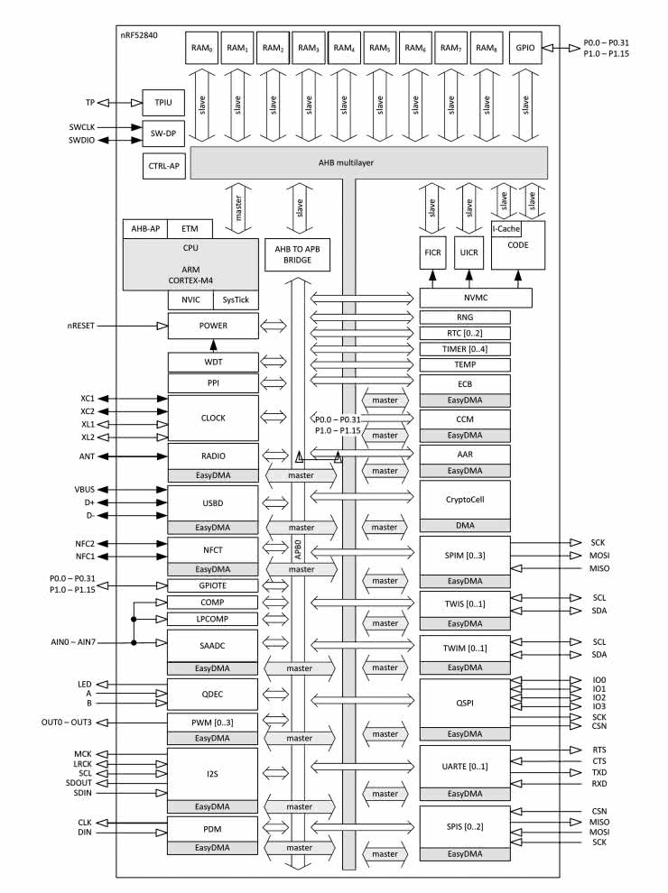 Obydwie serie bazują na tym samym układzie SoC – popularnym nRF52840 marki Nordic Semiconductor (fotografia 2). Układ ten integruje w swojej strukturze wydajny mikrokontroler z 64-megahercowym rdzeniem ARM Cortex-M4 i wbudowanym transceiverem 2,4 GHz zgodnym z Bluetooth 5.4. Do dyspozycji projektanta jest także wewnętrzny blok tagu NFC-A (do którego obsługi konieczne jest oczywiście podłączenie stosownej anteny). Ważną zaletą układów z serii nRF52 jest bardzo niski pobór prądu – SoC pobiera jedynie 52 μA/MHz podczas wykonywania programu z pamięci Flash, zaś w trybach obniżonego poboru mocy (bez podtrzymania zawartości pamięci RAM) wartość ta spada do 1,5 μA, a nawet 0,4 μA.
