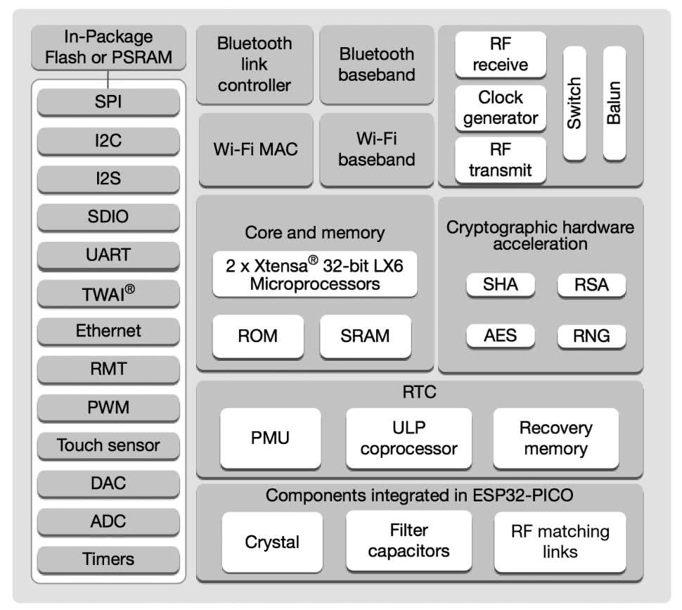 Jednym z ciekawszych układów SoC z oferty Espressif jest obecnie ESP32-PICO (rysunek 1). Układ obsługuje Wi-Fi 802.11b/g/n, Bluetooth v4.2 BR/EDR oraz Bluetooth LE i – co ciekawe – integruje w sobie nawet oscylator kwarcowy, niezbędne kondensatory, pamięć SPI Flash/PSRAM, a nawet obwód dopasowania impedancji w torze antenowym. W strukturze krzemowej znalazł się – oprócz wydajnego, 240-megahercowego, dwurdzeniowego procesora Xtensa LX6 – także obszerny zestaw bloków peryferyjnych, w tym szereg interfejsów komunikacyjnych (SPI, I²C, I²S, SDIO, UART, TWAI, Ethernet), przetworniki ADC i DAC, timery, interfejs czujników pojemnościowych oraz sprzętowy akcelerator kryptograficzny, wspierający szyfrowanie SHA, RSA, AES i zawierający generator liczb losowych. W niewielkiej obudowie LGA o wymiarach 7×7 mm znalazło się też 448 kB pamięci ROM, 520 kB SRAM oraz 16 kB dodatkowej pamięci SRAM współpracującej z RTC.