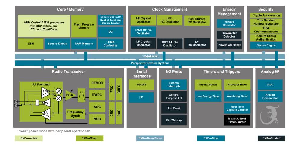 Opisane powyżej moduły bazują na nowoczesnym układzie SoC z serii EFR32MG marki Silicon Labs. Schemat blokowy przykładowego przedstawiciela tej rodziny – EFR32MG21 – pokazano na rysunku 9. Układ wspiera standardy Bluetooth LE (Bluetooth 5), ZigBee oraz Thread, a jego konstrukcja bazuje na 32-bitowym rdzeniu ARM Cortex-M33 (80 MHz), współpracującym z 1 MB pamięci Flash i 96 kB pamięci RAM. Wbudowany wzmacniacz RF pozwala na osiągnięcie mocy nadawania do 20 dBm. Wymiary układu (oferowanego w obudowie QFN) to 4×4 mm.