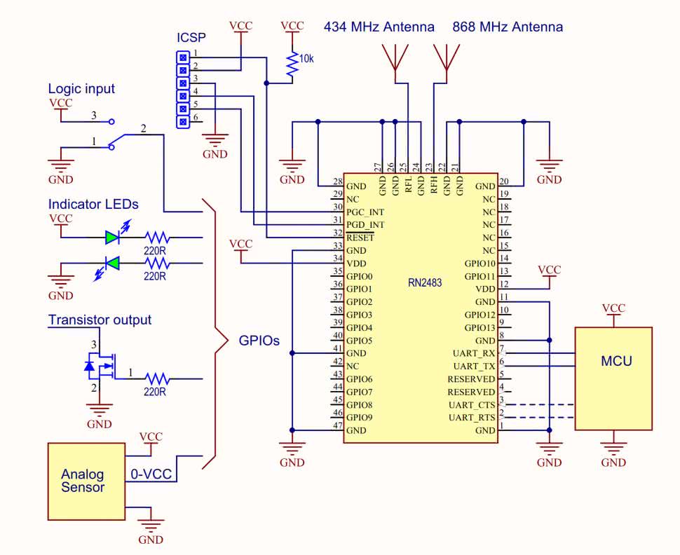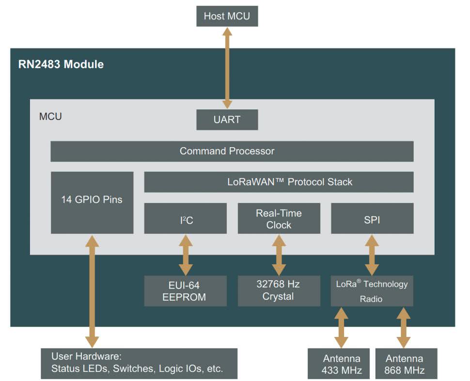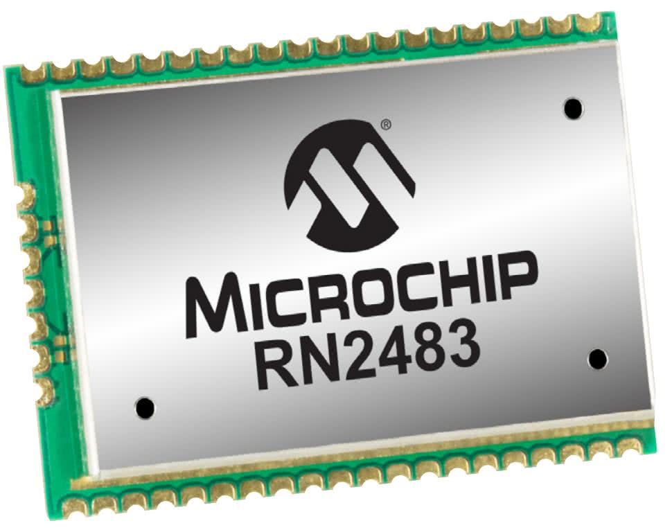 Microchip RN2483 (fotografia 7, rysunek 7) to z kolei gotowy moduł radiowy LoRaWAN o wymiarach 17,8×26,7×3,34 mm, pracujący na częstotliwościach 433 MHz oraz 868 MHz. Oprócz transceivera LoRa zawiera także wbudowany mikrokontroler, udostępniający interfejs UART z obsługą komend AT w celu łatwej integracji w docelowym systemie.