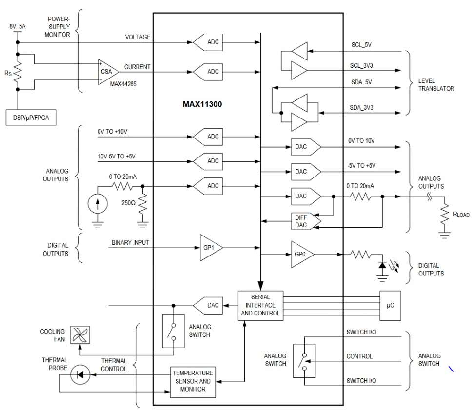 Na rysunku 15 znajduje się schemat regulatora kontrolującego temperaturę, stan wejść analogowych i cyfrowych oraz natężenie prądu. Jednocześnie ten sam układ generuje wyjściowe sygnały analogowe, na przykład na potrzeby PLC. Warto zwrócić uwagę, że zakresy przetwarzania zarówno ADC, jak i DAC, są różne dla różnych wyprowadzeń. To duża przewaga tego układu nad stopniami analogowymi budowanymi na piechotę, bowiem każdy taki przetwornik operuje w swoim zakresie i już, koniec kropka. Zmiana tego wymaga dodawania wzmacniaczy, dzielników lub przesuwników potencjału – zaś MAX11300 ma już to wszystko na pokładzie. Wszystkim może zarządzać niewielki mikrokontroler, komunikujący się z tym analogowo-cyfrowym „kombajnem” poprzez SPI.
