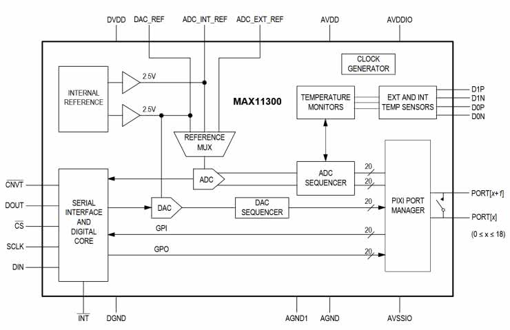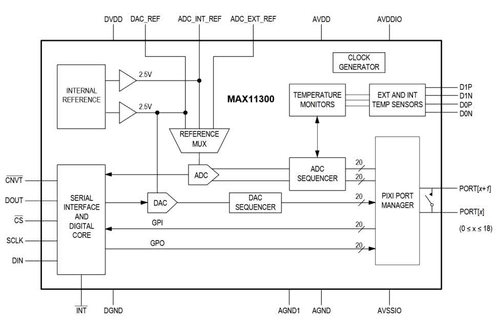Mniej zaawansowanym układem, lecz nadal analogowym z cyfrową „przystawką”, jest MAX11300 od Maxim Integrated (obecnie część koncernu Analog Devices). Nie jest to do końca mikrokontroler, bo nie realizuje programu. Zawiera przetworniki analogowo-cyfrowy i cyfrowo-analogowy wraz z niezbędnym dla nich oprzyrządowaniem (multiplekser napięcia referencyjnego oraz samo źródło napięcia odniesienia), szeregowy interfejs cyfrowy z cyfrowym blokiem sterującym i coś, co nosi nazwę PIXI – rysunek 14. Nie ma tutaj wzmacniaczy transimpedancyjnych czy o regulowanym wzmocnieniu, lecz za to można wygodnie konfigurować liczbę próbek uśrednianych z każdego wejścia ADC, jak również zakres przetwarzania tegoż.