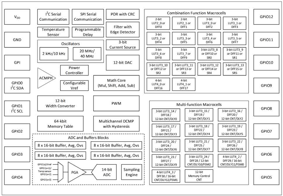 A czego tam nie ma! 14-bitowy przetwornik A/C z PGA i multiplekserem, bufory na dane wyjściowe, arytmetyczna jednostka logiczna, źródło prądowe, dwa oscylatory, DAC, komparator o zmiennej histerezie i wzmocnieniu, liczniki, interfejsy SPI i I²C, tablice funkcji kombinacyjnych i wielofunkcyjne makrokomórki. Co ciekawe, tak zaawansowany układ ma tylko 16 wyprowadzeń, rozrysowanych na rysunku 11. Nie ma konieczności dołączania całego „stada” kondensatorów odprzęgających zasilanie, rezonatorów kwarcowych, kilku stabilizatorów napięcia i innych rzeczy, które z reguły znajdują się w otoczeniu zaawansowanych mikrokontrolerów – producent zaleca tylko kondensator 100 nF przy wyprowadzeniach zasilania. Wszystkie pozostałe wyprowadzenia można skonfigurować z dosyć dużą dowolnością, tak samo jak bloki znajdujące się wewnątrz tego układu.