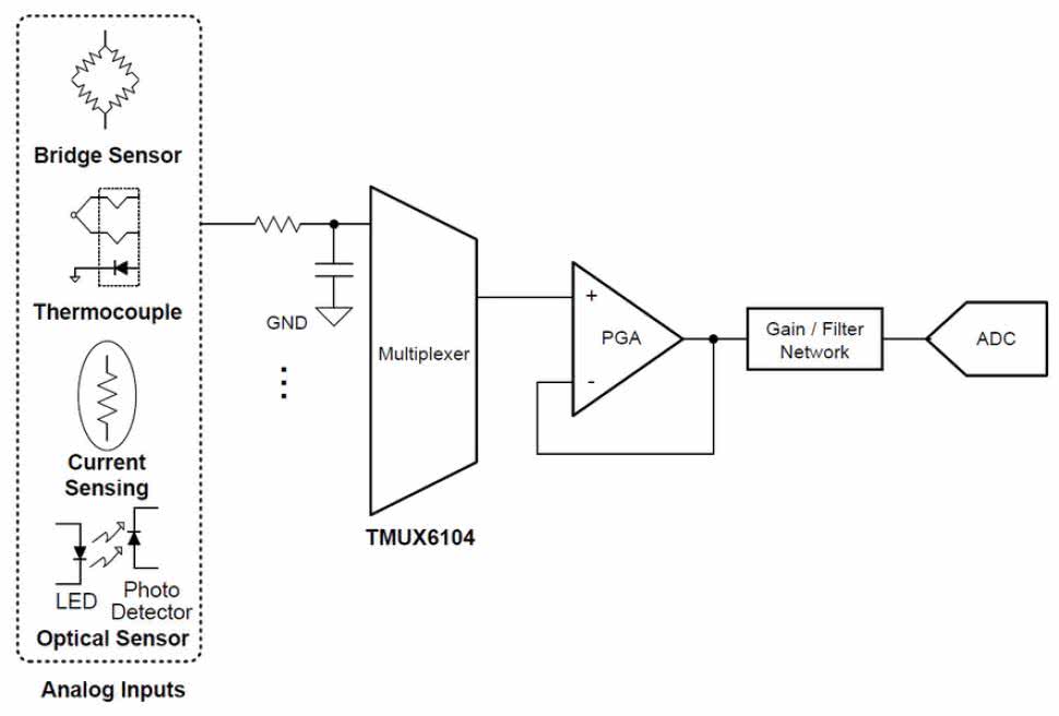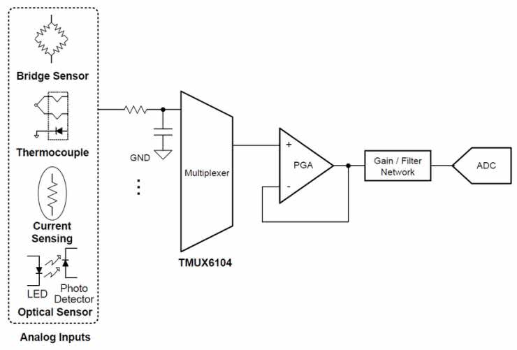 Doprowadzenie sygnału do PGA w przypadku obsługi kilku źródeł, na przykład czujników, wymaga użycia multipleksera, jak na rysunku 7. Multipleksery analogowe, zawarte w strukturach mikrokontrolerów, bywają lepsze i gorsze, lecz czasem dokładność pomiaru wymaga użycia zewnętrznego przełącznika sygnałów analogowych. Tutaj z pomocą może przyjść chociażby układ TMUX6104, oferujący cztery wejścia i jedno wyjście. Producent chwali się, że każde wejście ma pojemność 5 pF i prąd upływu wynoszący jedynie 5 pA!