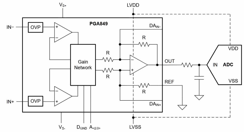 Jednym z takich układów jest nowoczesny PGA849 od firmy Texas Instruments. To gotowy wzmacniacz pomiarowy (instrumentalny), który ma do wyboru aż osiem różnych wzmocnień: od 0,125 V/V do 16 V/V. Zmiany wzmocnienia dokonuje się poprzez zmianę stanów logicznych na trzech wejściach A0, A1 i A2, co powoduje przełączanie rezystorów ustalających wzmocnienie (rysunek 5).