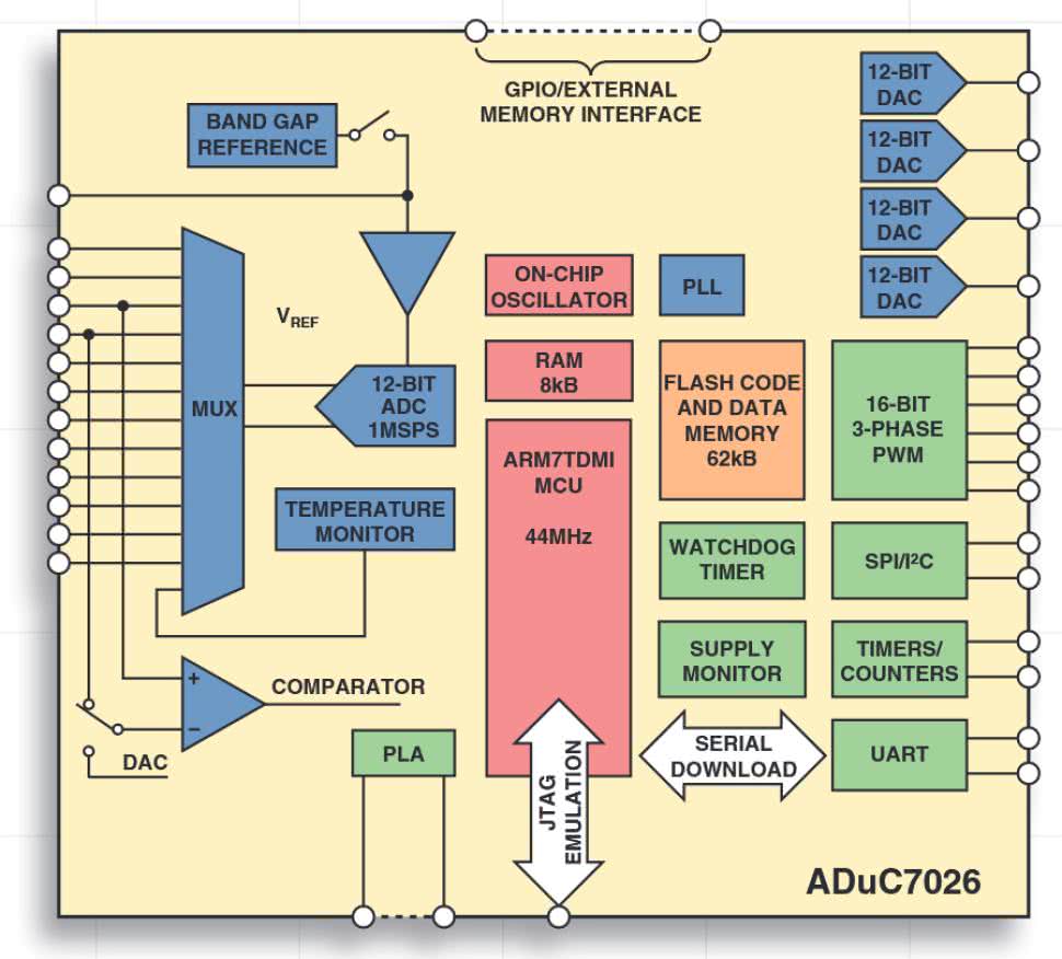 Na rysunku 2 znajduje się schemat blokowy mikrokontrolera ADuC7026. Od strony cyfrowej nie ma się czego przyczepić: wydajny rdzeń ARM, sporo pamięci, interfejsy sprzętowe SPI i I²C, a także timery wspierające realizację sterowników silnika. Użytkownik ma do dyspozycji nawet kawałek programowalnego układu logicznego w postaci tzw. PLA.