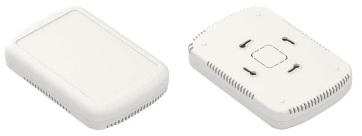 Firma Maszczyk wdrożyła z kolei specjalną obudowę ZM4.3J ABS (fotografia 24) przeznaczoną do budowy estetycznych urządzeń wieszanych na ścianie. Niskoprofilowa konstrukcja składa się z dwóch pokryw: przedniej, zawierającej obniżenie pod klawiaturę membranową lub panel samoprzylepny oraz tylnej, w której umieszczono cztery rzędy otworów wentylacyjnych oraz specjalnie ukształtowane otwory montażowe.