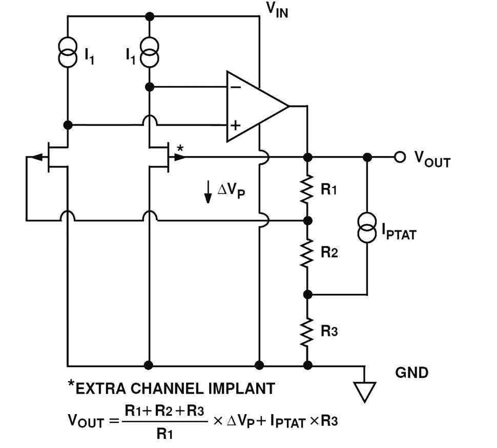 Pomiędzy dwoma opisanymi wyżej, głównymi technologiami pojawiły się architektury pośrednie i pochodne. Dokumentacja Analog Devices opisuje między innymi referencje XFET (ang. eXtra implanted FET), oparte na właściwościach tranzystorów JFET – rysunek 18 – i zaprojektowane tak, by połączyć część zalet struktur typu bandgap oraz buried Zener: relatywnie niskie napięcie pracy, niewielki pobór prądu, mały dryf i mniejszy szum niż w typowych, prostych bandgapach. Przykład? Proszę bardzo – układ ADR290 (dziś już wycofany z oferty) mógł być zasilany napięciem rzędu 2,7 V, generując przy tym stabilne napięcie wyjściowe równe 2,048 V o współczynniku termicznym 8 ppm/°C i pobierając zaledwie 12 μA prądu zasilania. Dokładność początkowa wynosiła natomiast ±2 mV, czyli około 0,1% – owszem, można lepiej, ale w wielu przypadkach ważniejsza jest stabilność odniesienia, niż bezwzględna dokładność „prosto z fabryki”.