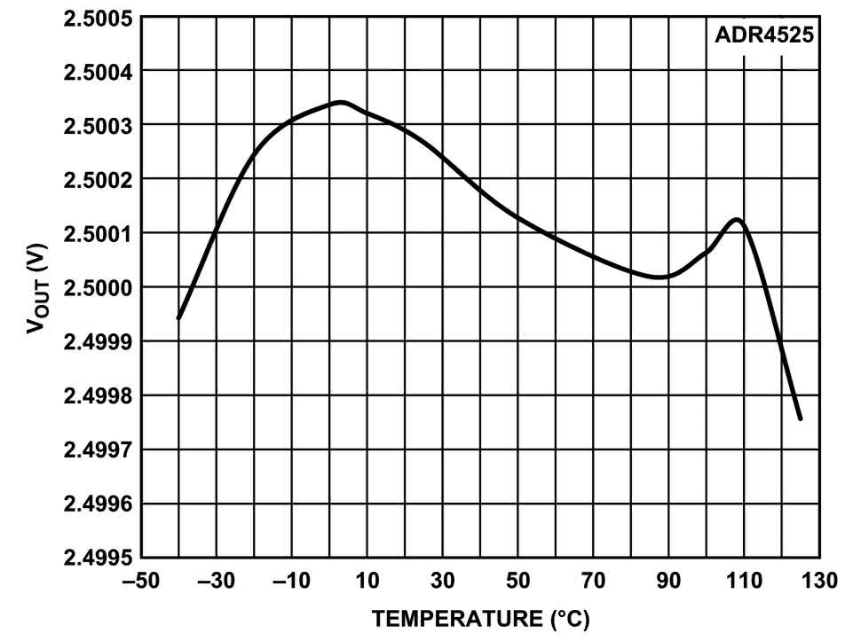 Warto też przeliczać ppm/°C na wartość bezwzględną. Dla VREF=2,5 V dryf 2 ppm/°C oznacza zmianę o 5 μV/°C. Przy 50°C różnicy temperatury daje to 250 μV, czyli 0,01%, oczywiście tylko przy założeniu, że charakterystyka termiczna przebiega w przybliżeniu liniowo, przynajmniej w rozpatrywanym zakresie temperatur pracy. Tak czy inaczej, w systemie 16-bitowym o pełnej skali 2,5 V jeden LSB to około 38 μV, więc sam dryf może w najgorszym wypadku odpowiadać nawet kilku LSB. Im wyższa rozdzielczość i im dłuższy czas pracy bez rekalibracji, tym stabilniejsze temperaturowo źródło jest potrzebne. Nieprzypadkowo w literaturze wiąże się czasem układy typu buried Zener z systemami 14-, 16- czy 24-bitowymi, a prostsze bandgapy raczej z niższymi rozdzielczościami (10...12 bitów). Dziś granice te zatarły się znacznie bardziej niż kiedyś, ale sama logika obliczeń i procesu decyzyjnego pozostaje słuszna.