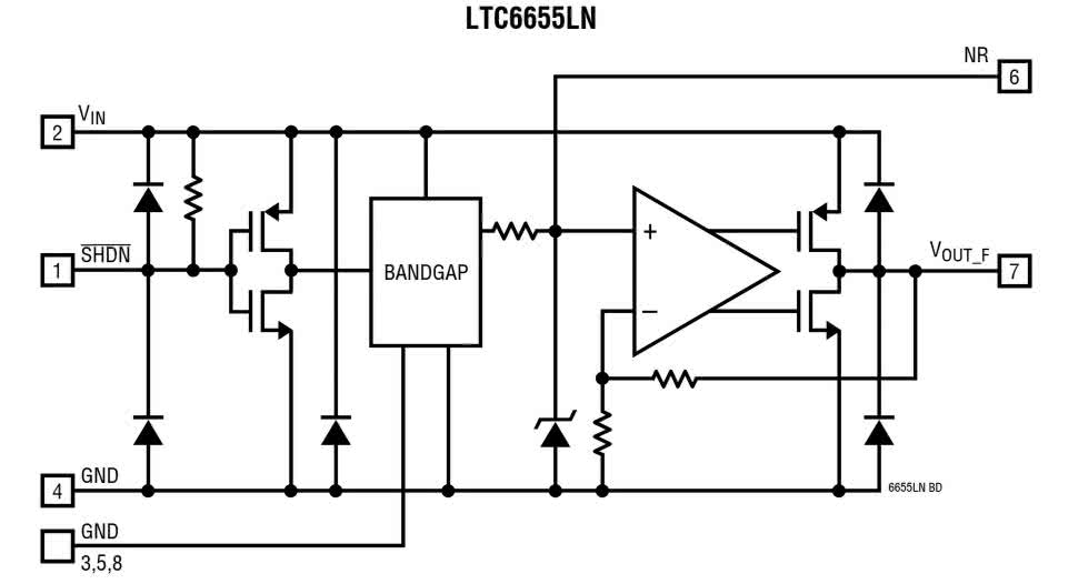 Czasem można spotkać się z jeszcze innymi liniami: przykładowo w przypadku układu LTC6655LN dostępny jest pin NR (ang. Noise Reduction), do którego należy podłączyć kondensator filtrujący napięcie pochodzące z wbudowanego wzorca napięcia i podawane – poprzez szeregowy rezystor – na wejście nieodwracające wzmacniacza błędu (rysunek 6).