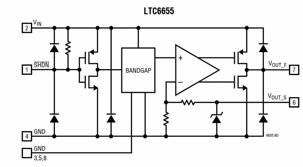 Jeszcze ciekawszym przykładem nowoczesnego bandgapu klasy premium jest wspomniany na początku artykułu LTC6655. Jak to zwykle bywa w przypadku układów scalonych, których oznaczenie zaczyna się od liter „LTC” (spuścizna po firmie Linear Technology, przejętej niecałą dekadę temu przez ADI), nie jest to układ najtańszy – w detalu jego koszt zaczyna się od ponad 60 złotych. Jest to jednak układ bardzo dokładny i stabilny: dryf maksymalny to 2 ppm/°C, dokładność bazowa wynosi ±0,025%, zaś poziom szumu to zaledwie 0,25 ppm pk-pk w dolnym paśmie częstotliwości.