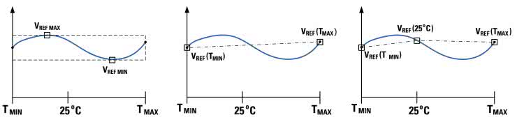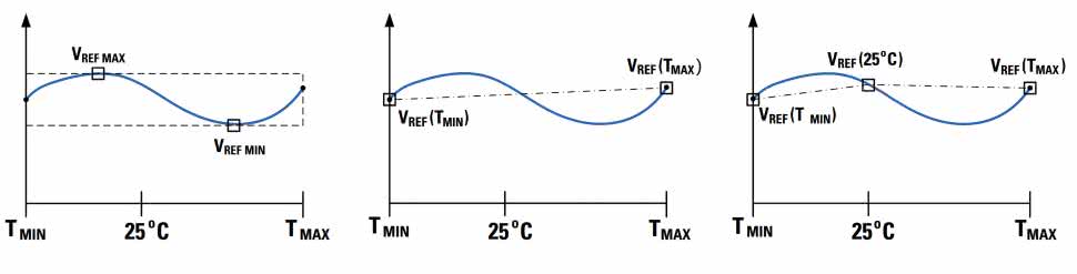 Drugim parametrem, zwykle ważniejszym, jest zatem dryf temperaturowy (ang. temperature coefficient, TC). W kartach katalogowych jest on najczęściej wyrażany w jednostce, która już wielokrotnie przewinęła się w tym artykule, czyli w ppm/°C albo (rzadziej) w mierze bezwzględnej, np. w μV/°C czy mV/°C. Na pierwszy rzut oka ppm/°C wydaje się wartością oczywistą, ale diabeł tkwi w metodzie pomiaru. Producenci stosują różne sposoby wyznaczania TC: metodę pudełkową („box”), metodę nachylenia odcinka i inne (patrz rysunek 21). Dwa układy opisane tym samym parametrem „10 ppm/°C” nie muszą więc zachowywać się identycznie. W praktyce najbezpieczniej patrzeć nie tylko na jedną liczbę, lecz także na wykres VOUT=f(T) oraz noty wyjaśniające metodologię pomiaru. Jeżeli przetwornik pracuje w zakresie 0...50°C, średni dryf określony dla pełnego zakresu roboczego –40...125°C może znacznie zafałszowywać to, co naprawdę zdarzy się w warunkach eksploatacji.