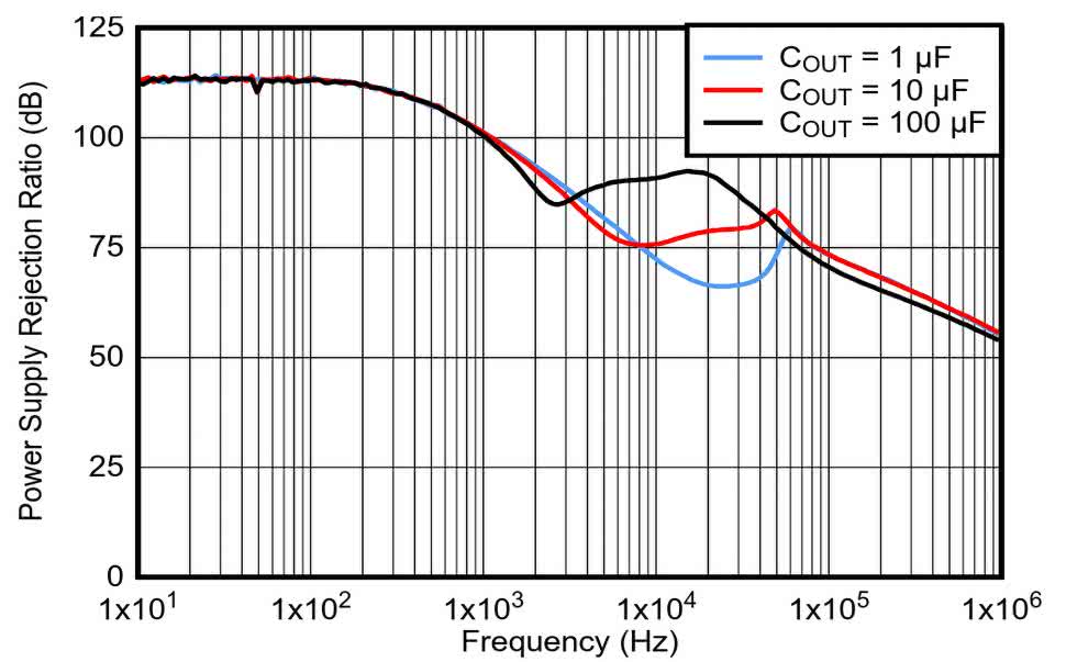 W niektórych aplikacjach równie ważna jest wartość określana line regulation, której zdecydowanie nie należy jednak mylić ze współczynnikiem PSRR (ang. Power Supply Rejection Ratio). Ten pierwszy parametr to nic innego, jak tylko odporność na zmiany napięcia zasilającego, które w jakimś stopniu przenoszą się na wyjście źródła odniesienia. Podstawową jednostką regulacji napięciowej jest μV/V lub ppm/V, ale jej zastosowanie ma sens tylko w warunkach statycznych. Przy wzroście częstotliwości tłumienie wahań na szynie zasilania silnie się pogarsza, co jest zresztą zjawiskiem dobrze znanym ze stabilizatorów liniowych. Producenci ostrzegają, że przy kilkuset kHz tłumienie może spadać o 30...50 dB, dlatego wejście referencji powinno być starannie odsprzęgnięte, co nie powinno zresztą dziwić żadnego praktykującego elektronika. Nie należy jednak pomijać tej kwestii ani traktować jej zbyt pobieżnie, gdyż wiele współczesnych urządzeń zasila źródło napięcia odniesienia z wyjścia przetwornicy impulsowej. Nawet jeśli średnia wartość napięcia zasilania jest poprawna i w miarę stała, to wysokoczęstotliwościowe „śmieci” potrafią przebić się przez niedoskonałe PSRR i modulować wyniki pomiarów czy też „przesączać się” na wyjście przetwornika cyfrowo-analogowego. Doskonałą ilustracją przebiegu PSRR w funkcji częstotliwości jest rysunek 23, zaczerpnięty z noty katalogowej układów z serii REF50xxEI. Jak na dłoni widać wszystkie składowe, które wynikają zarówno z efektów pasożytniczych, jak i z niedoskonałości samego układu. W niższym przedziale pasma, czyli do około 1 kHz, PSRR jest dość wysoki i wynosi początkowo ponad 110 dB, spadając do 100 dB przy 1 kHz. Potem krzywe zaczynają się od siebie oddalać, przy czym największa różnica jest widoczna przy częstotliwościach kilkunastu kiloherców. W tym obszarze możliwości źródła „walczą” jeszcze ze spadającą powoli skutecznością działania kondensatorów, które coraz gorzej radzą sobie ze składowymi wysokoczęstotliwościowymi. Gdy w miarę wzrostu częstotliwości wahań napięcia zasilającego sam układ przestaje skutecznie tłumić te zmiany, a w kondensatorach zaczyna dochodzić do głosu szeregowa indukcyjność, krzywe znów zaczynają się na siebie nakładać, razem spadając do zaledwie 50 dB w rejonie częstotliwości 1 MHz. Nietrudno się domyślić, że dalej może być już tylko gorzej.