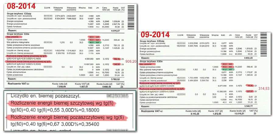 Rysunek 1. Rachunek za energię elektryczną z wyszczególnionymi karami za brak kompensacji mocy bierne
