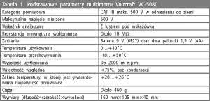 Podstawowe parametry multimetru umieszczono w tabeli 1. Multimetr jest zasilany dwoma 1,5-woltowymi AA bateriami oraz jedną 6F22 (cynkową) lub 6LR61 (alkaliczną) o napięciu 9 V. Dwa paluszki służą do zasilania miernika rezystancji, natomiast bateria 9-woltowa zasila pozostałe obwody przyrządu. Baterie umieszczono pod klapką i są one dostępne po odkręceniu śruby blokującej.