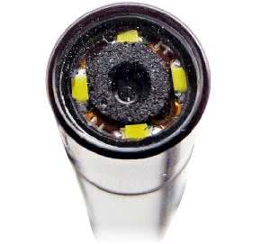 Głowica endoskopu ma wbudowany oświetlacz wykonany z 4 białych diod LED o regulowanym natężeniu światła (za pomocą potencjometru na uchwycie endoskopu). Całość jest osadzona na giętkim wysięgniku - rurce o długości blisko 90 centymetrów, którą można wyginać np. przepychając głowicę przez jakieś korytka kablowe, wewnątrz szafy lub obudowy urządzenia. Średnica głowicy z zainstalowaną kamerą i oświetlaczem wynosi 8 mm (fotografia 1) i to ona limituje wielkość otworu, przez który będziemy mogli dostać się do wnętrza urządzenia.
