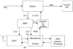 Na rysunku 1 pokazano schemat układu zastosowanego w każdej jednostce oświetleniowej. Zasilacz diod jest sterowany za pośrednictwem wyjścia PWM w mikrokontrolerze dostarczającym sygnału 0-10 V odpowiadającego jasności świecenia LED.