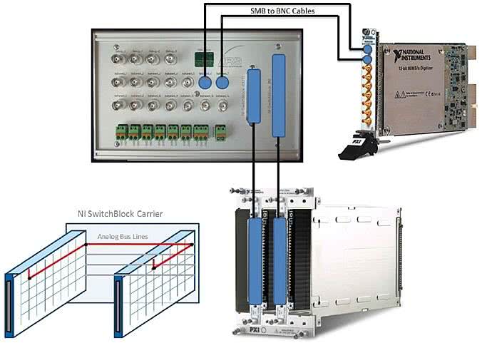 Dodatkowo, sygnały stymulujące z modułów PXI mogą być poprowadzone poprzez IAP oraz NI SwitchBlock prosto do testowanej jednostki ECU.