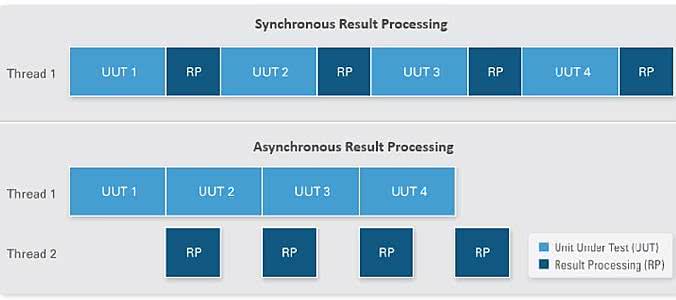 Rysunek 7. Asynchroniczne przetwarzanie wyników zaimplementowane w oprogramowaniu NI TestStand pozwala na rozpoczęcie testów kolejnego układu podczas przetwarzania wyników poprzedniego