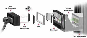 Odbiornik gniazda przyłączeniowego (rysunek 12) odpowiada za fizyczne połączenie z oprzyrządowaniem pomiarowym, przełączającym, zasilającym i systemem zarządzania obciążeniem. Połączenia te są wykonywane za pomocą kabli wielożyłowych, obwodów drukowanych (PCB), wtyków bananowych i przewodów koncentrycznych. Używane w odbiorniku złącza pozwalają na tworzenie wytrzymałych połączeń umożliwiających realizację wielu cykli pracy. W przypadku konserwacji ITA, dostępne są niedrogie złącza zamienne.