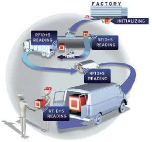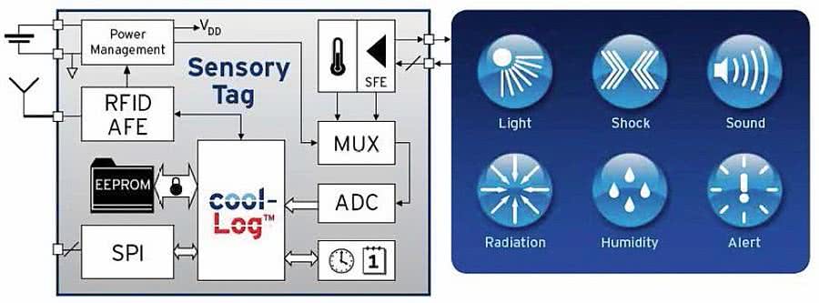Konwencjonalne, pasywne znaczniki RFID zawierają małą ilość nieulotnej pamięci, w której zapisany jest unikalny kod identyfikacyjny. Wyobraźmy sobie jednak, co by było, gdyby znacznik wyposażyć dodatkowo w funkcję rejestrowania danych. Dałoby się wtedy tworzyć nowe tagi RFID, które mogłyby komunikować się z czujnikami. Zapisywałyby np. informacje o temperaturze, wibracjach i wilgotności, na jakie narażony był pakunek (rysunek 1).