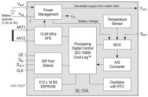 Gdy jest skanowany, wybudza się i pobiera typowo 4 mA prądu z odbieranego pola elektromagnetycznego. Z tych 4 mA, jedynie 150 µA wystarczy do obsłużenia interfejsu zewnętrznego sensora i wbudowanego czujnika temperatury (rysunek 2).