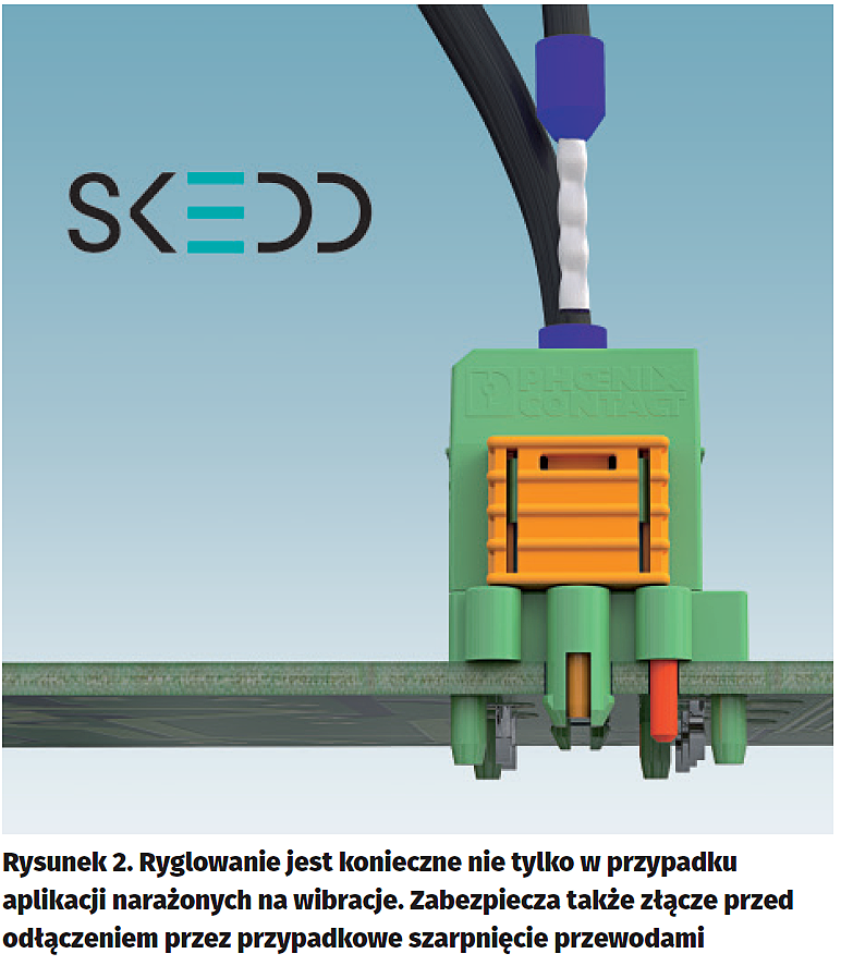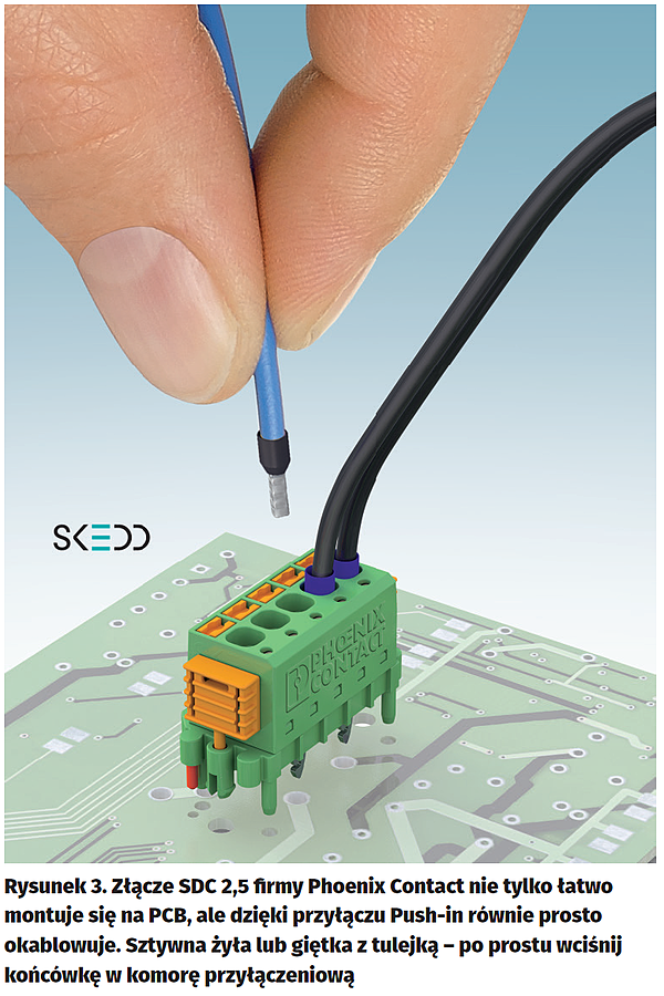 Nowe złącze serii SDC 2.5, jako pierwsze w ofercie firmy Phoenix Contact z serii elementów z przyłączem SKEDD, dostępne jest w rastrze 5 mm, od 1 do 16 biegunów. Nominalne parametry elektryczne to 12 A i 320 V. Samo przyłącze przewodów zrealizowano w technologii Push-in, z dodatkowym przyciskiem służącym do zwalniania przewodu. Akceptują przekroje od 0,2 mm² do 2,5 mm² i mają dodatkowe miejsce na sondę pobierczą umożliwiającą pomiar napięcia bez rozłączania połączenia. Wtyk ma skuteczne zabezpieczenie przed rozłączeniem – po jego obu stronach wykonane są nity rozpierane wsuwanymi bolcami. Dostosowane są do PCB o grubości 1,6 mm, które są najczę?ciej stosowanym standardem.